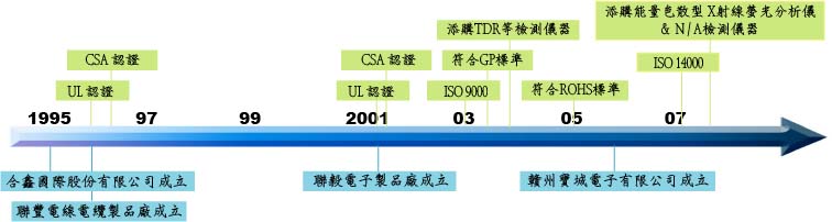 『 合鑫國際股份有限公司 』創立於一九九五年,同年十二月在中國廣東省東莞市石碣鎮設置『 聯豐電線電纜制品廠 』,註冊資本八百二十五萬港元。經營範圍為生產製造電線、電腦排線、網路線、影音視訊線、音響電話線等各式線材。合鑫相信客戶的滿意是企業成長的唯一方法,我們結合專業技術人員及管理人員為核心,用熱情培育、珍惜、關懷員工,並配合客戶需求實現良好的品質、準確的交期、合理的價格、完善的服務來贏得您的肯定。合鑫以誠信為基礎,以“創新、合作、積極、穩健”為理念,不斷在產品技術及經營管理上提升實力,於追求高品質的過程中與您共同發展共同進步,創造雙贏,在您的支持及全體同仁的踏實努力下蓬勃發展。 為滿足日益增加的市場需求,拓展海外市場,合鑫於二○○一年六月在東江之珠 ─ 石碣鎮,成立製造二廠『 聯毅電子製品廠 』,註冊資本五百萬港元。主要生產經營電線、電腦排線連接器、塑膠、五金模具研發製造及組裝,於二○○一年九月十月及二○○二年七月先後獲得UL、CSA等認證,並重金投資各項測試儀器,研製一系列環保無毒產品;二○○五年十一月於江西省成立製造三廠『 贛州寶城電子有限公司 』,註冊資本壹百萬美元,跨足生產銷售防盜器、USB、IEEE1394與SATA等高速傳輸之相關產品,包含儲存外接盒、介面卡、集線器、讀卡器等電腦週邊電子產品,並代工無鉛SMT、DIP加工、電子產品組裝加工,產品遠銷美國、加拿大、日本及歐洲國家,用專業創造客戶及全體同仁的最大利益。
